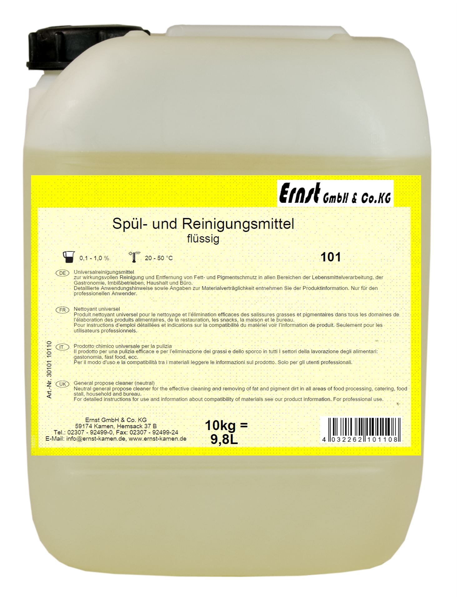 Spül- und Reinigungsmittel ist ein universell in allen Bereichen der Lebensmittelverarbeitung einsetzbares neutrales Reinigungsmittelkonzentrat für die Reinigung aller wasserbeständigen Oberflächen zur Entfernung von Fett- und Allgemeinschmutz.