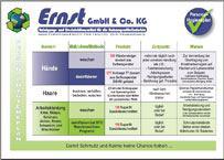 Die Ernst GmbH & Co. KG ist seit 1998 Ihr zuverlässiger Partner für Reinigungs- und Desinfektionsmittel in der Lebensmittelindustrie und dem Lebensmittelhandwerk.