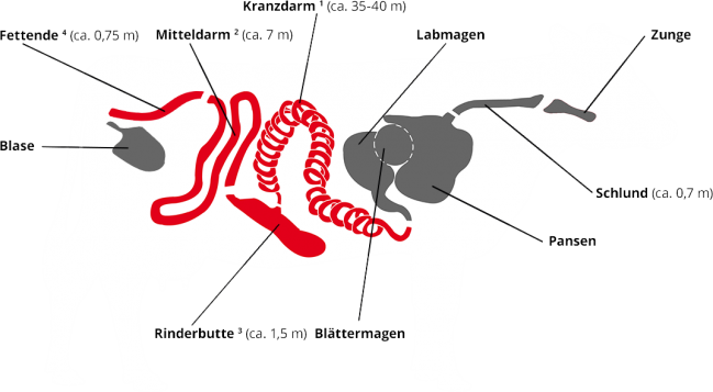 Rinderdärme wie Kranzdarm und Mitteldarm, Fettende und Butte sind als Hülle für hochwertige Roh-, Koch- und Brühwürste hervorragend geeignet.